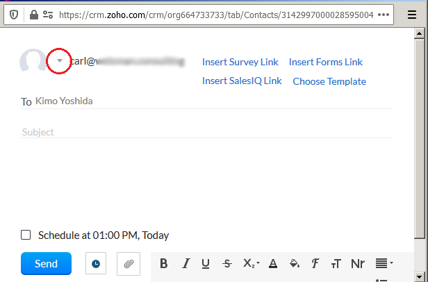 6) From the menu that appears, choose support@comevo.com. You will see a note telling you that the email will be sent from Zoho CRM.